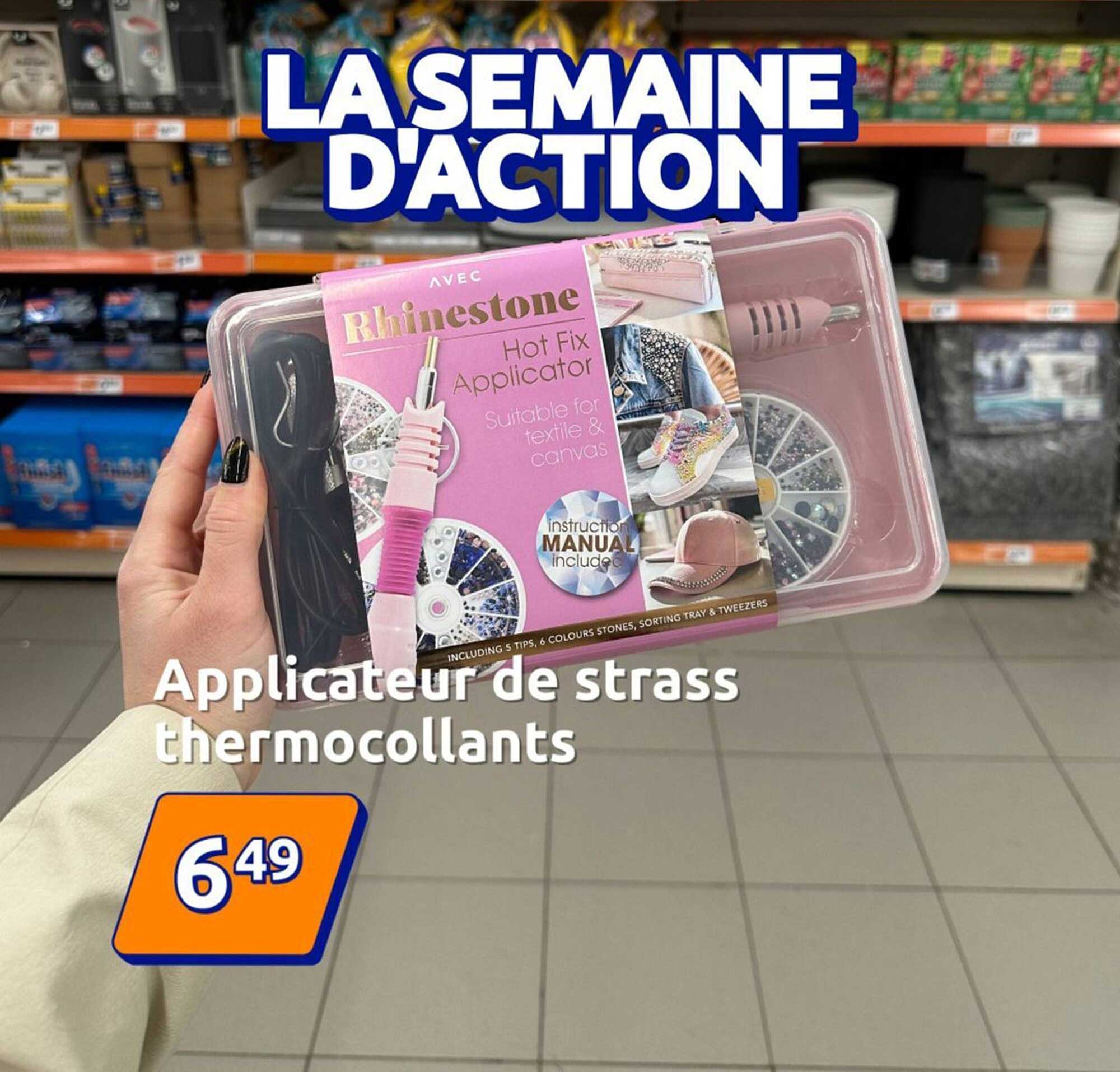 Découvrez dès maintenant la offre Applicateur de strass thermocollants dans le catalogue de Action. Cette offre est valable du 20/03/2025 au 02/04/2025.