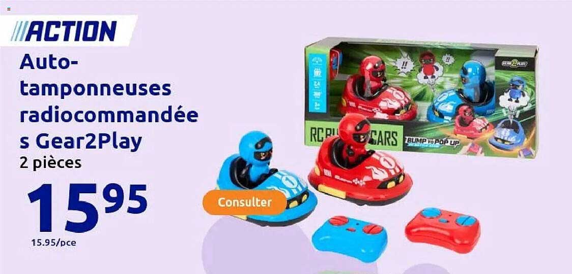 Découvrez dès maintenant la offre Auto-tamponneuses radiocommandées Gear2Play 2 pièces dans le catalogue de Action. Cette offre est valable du 29/10/2025 au 04/11/2025.