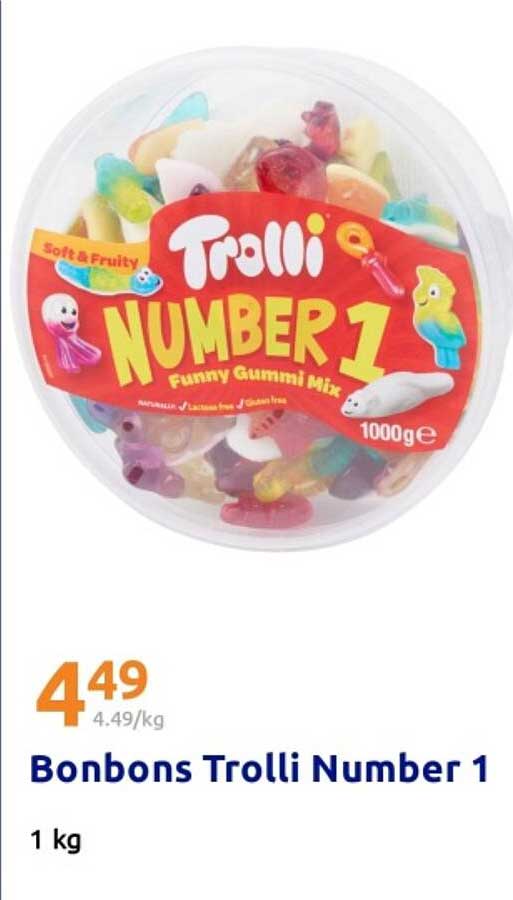 Avis aux amateurs de sucreries ! Actuellement, les Bonbons Trolli Number 1 sont disponibles à seulement 4,49 €, ce qui fait 4,49 €/kg. C'est un vrai bon plan par rapport à leur prix habituel, et une occasion à ne pas manquer pour faire le plein de douceurs.