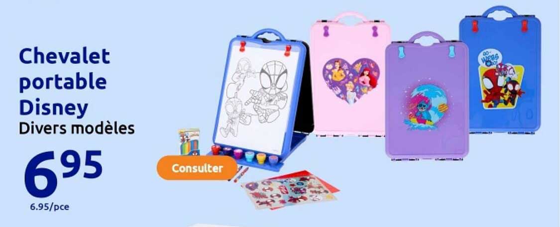 Découvrez le chevalet portable Disney, un compagnon de jeu idéal pour vos enfants ! Avec divers modèles à choisir, chaque petit artiste pourra s'exprimer librement tout en profitant de ses personnages préférés. Cette offre, valable du 15 au 21 octobre 2025, fait de ce chevalet un must-have pour stimuler la créativité des tout-petits.