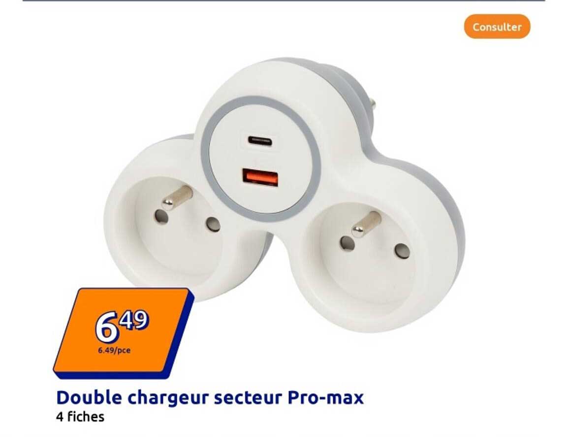 Découvrez dès maintenant la offre Double chargeur secteur Pro-max dans le catalogue de Action. Cette offre est valable du 23/04/2025 au 29/04/2025.