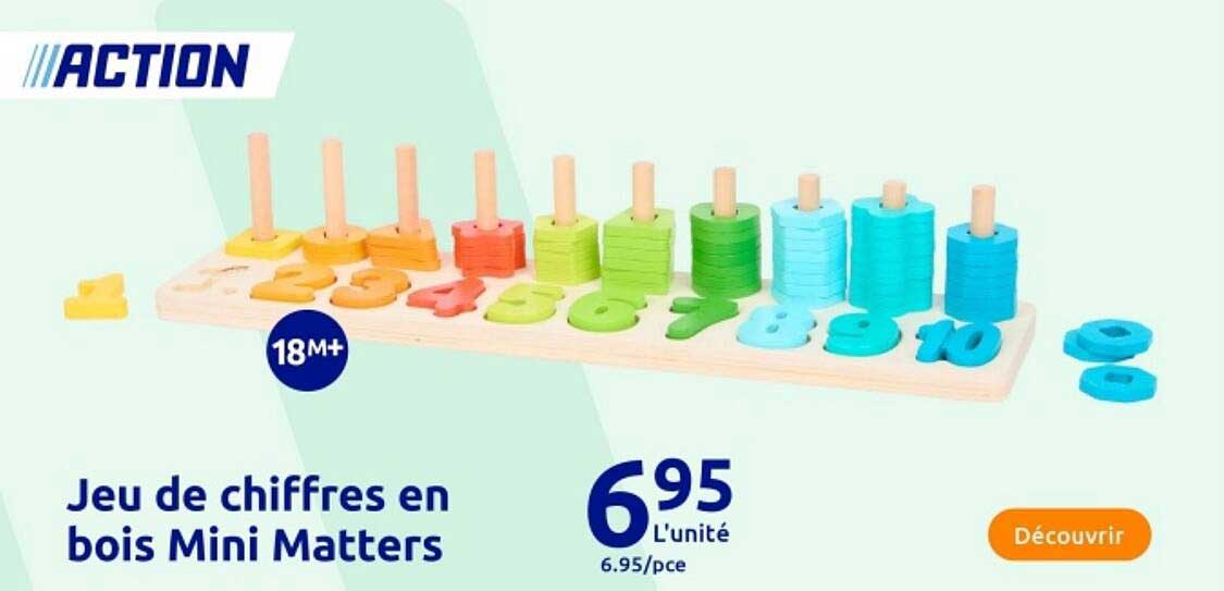 Découvrez dès maintenant la offre Jeu de chiffres en bois Mini Matters dans le catalogue de Action. Cette offre est valable du 30/10/2024 au 05/11/2024.