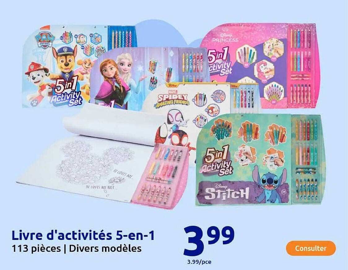 Découvrez le livre d'activités 5-en-1, une excellente opportunité pour divertir vos enfants tout en stimulant leur créativité. Avec 113 pièces incluses, variant entre coloriages, activités ludiques et accessoires, ce set promete des heures de plaisir. Ne manquez pas cette offre valable du 29 octobre au 4 novembre 2025, parfaite pour préparer des activités en intérieur durant les jours pluvieux.