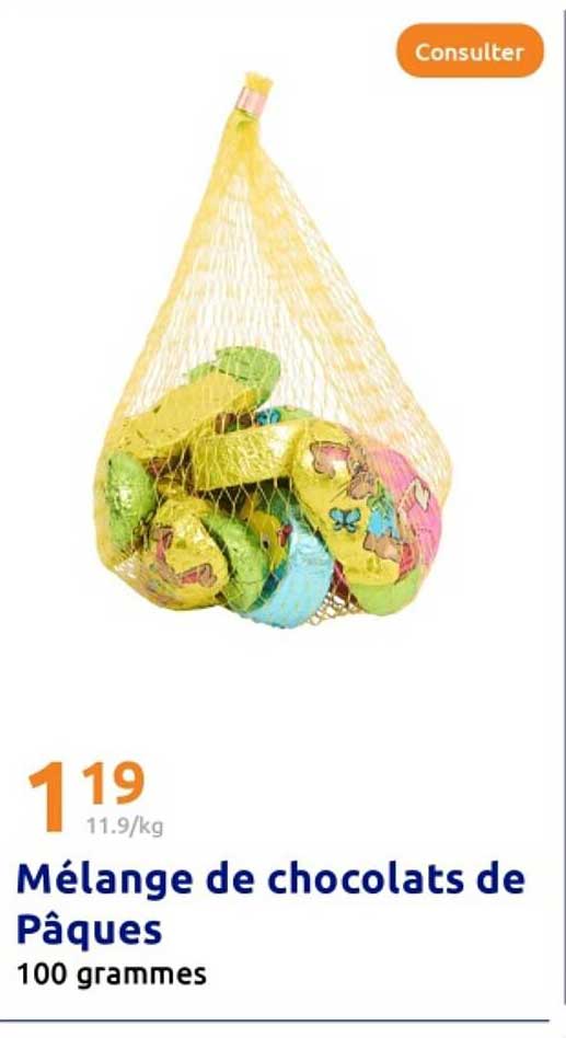 Découvrez l'offre de Mélange De Chocolats De Pâques chez Action! Cette offre fantastique est maintenant disponible dans le nouveau catalogue de Action. Profitez de cette occasion et économisez considérablement sur votre achat.