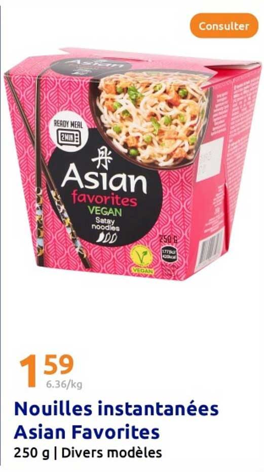 Découvrez l'offre de Nouilles Instantanées Asian Favorites chez Action! Cette offre fantastique est maintenant disponible dans le nouveau catalogue de Action. Profitez de cette occasion et économisez considérablement sur votre achat.