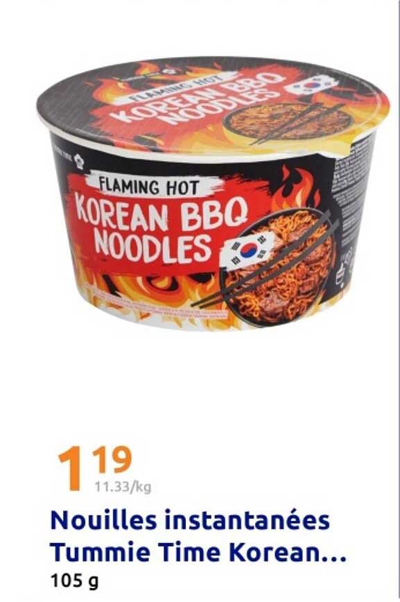 Vous aimez les plats relevés et savoureux ? Ne manquez pas l’opportunité de découvrir les nouilles instantanées Tummie Time Korean BBQ ! Disponibles à un prix incroyable, ces nouilles séduiront vos papilles avec leurs saveurs authentiques. Parfaites pour un repas rapide ou un en-cas épicé, elles apporteront une touche de cuisine coréenne à votre table. Cette offre est valable du 2025-10-01 au 2025-10-07, alors n’attendez pas pour en profiter !