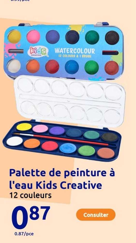 Vous cherchez à stimuler la créativité de votre enfant ? Ne manquez pas notre promotion sur la palette de peinture à l'eau Kids Creative. Avec 12 couleurs éclatantes, cette palette est parfaite pour encourager l'expression artistique des plus jeunes. Utiliser des couleurs variées aide non seulement les enfants à développer leurs compétences artistiques, mais aussi leur imagination !
