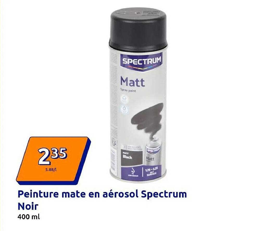 Découvrez dès maintenant la offre Peinture mate en aérosol Spectrum Noir dans le catalogue de Action. Cette offre est valable du 22/10/2025 au 28/10/2025.