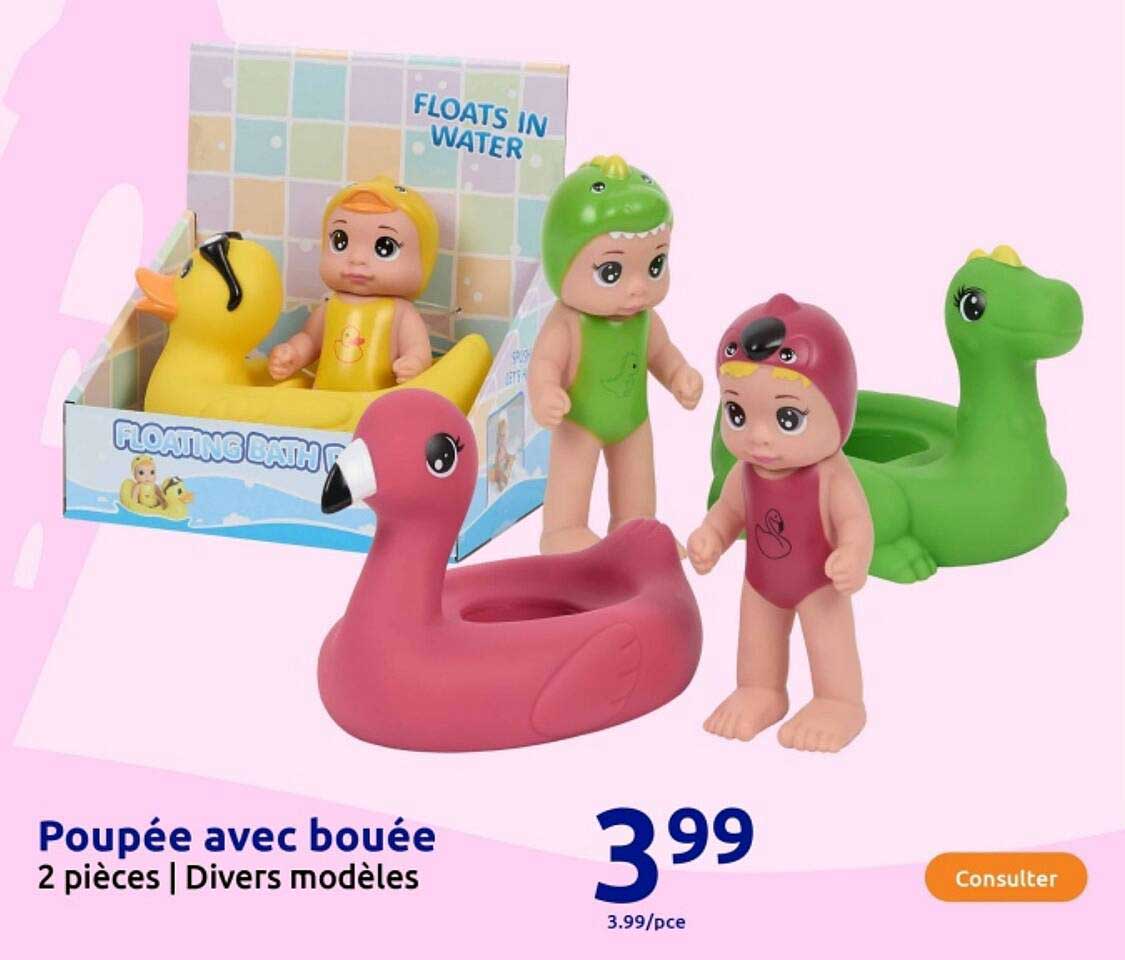 Découvrez une offre ludique idéale pour égayer les heures de bain de vos enfants ! La poupée avec bouée est non seulement amusante, mais elle stimule aussi l'imagination des petits. Disponible en divers modèles, elle est parfaite pour s'amuser dans l'eau tout en restant en sécurité.