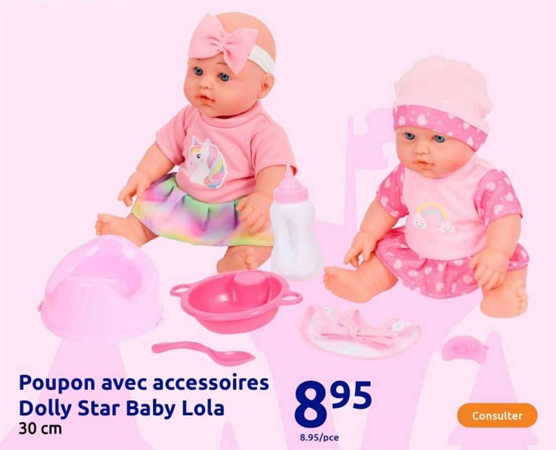 Découvrez dès maintenant la offre Poupon avec accessoires Dolly Star Baby Lola dans le catalogue de Action. Cette offre est valable du 05/11/2025 au 11/11/2025.