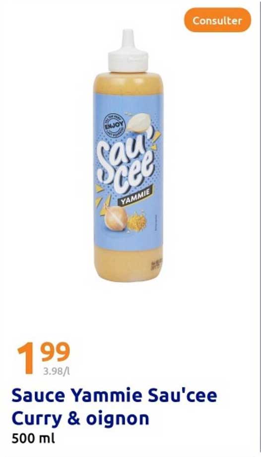 Découvrez l'offre de Sauce Yammie Sau'cee Curry & Oignon chez Action! Cette offre fantastique est maintenant disponible dans le nouveau catalogue de Action. Profitez de cette occasion et économisez considérablement sur votre achat.