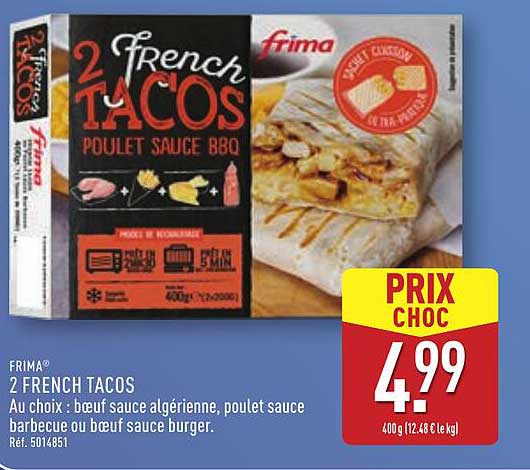Découvrez une offre irrésistible de 2 French Tacos au prix choc de 4,99 €. Que vous soyez en quête d’un repas rapide ou d'une collation savoureuse, ce produit saura vous séduire. Parfait pour un dîner improvisé ou une pause déjeuner, ces tacos s’adaptent à tous vos envies gastronomiques.