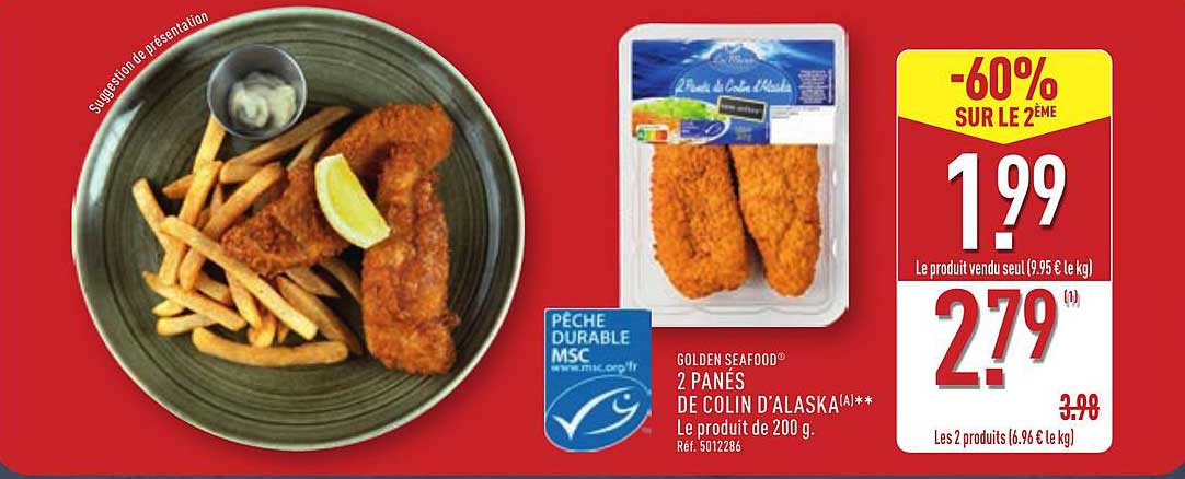 Découvrez cette promotion immanquable sur les 2 panés de colin d'Alaska de la gamme GOLDEN SEAFOOD. Si vous cherchez un plat savoureux, facile à préparer et idéal pour toute la famille, cette offre est faite pour vous. En faisant le plein de ces panés croustillants, vous apportez une touche de mer à vos repas tout en réalisant des économies.