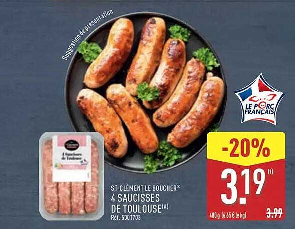 Découvrez les savoureuses et juteuses 4 Saucisses de Toulouse, une spécialité française qui ravira les amateurs de viande ! Disponibles chez ALDI, elles sont parfaites pour vos barbecues et vos repas en famille. Cette offre est valable du 2025-04-08 au 2025-04-14, ne la manquez pas !
