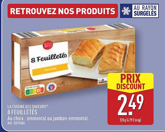 Découvrez les savoureux 8 Feuilletés de la marque La Cuisine des Saveurs, un incontournable de vos apéritifs ou de vos repas convivial. Disponibles au choix avec du fromage emmental ou du jambon-emmental, ces feuilletés sont parfaits pour régaler vos invités ou pour un repas rapide en solo. Leur texture croustillante et leur garniture savoureuse en font un véritable délice à savourer à tout moment de la journée.