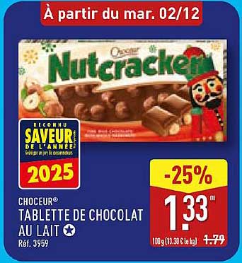 Découvrez l'irrésistible tablette de chocolat au lait Choceur® Nutcracker, une excellente occasion de se régaler sans se ruiner ! Cette délicieuse friandise est parfaite pour les moments de partage ou pour se faire plaisir. Avec cette promotion, vous avez la chance de savourer le goût riche du chocolat au lait, tout en profitant d'une réduction significative.