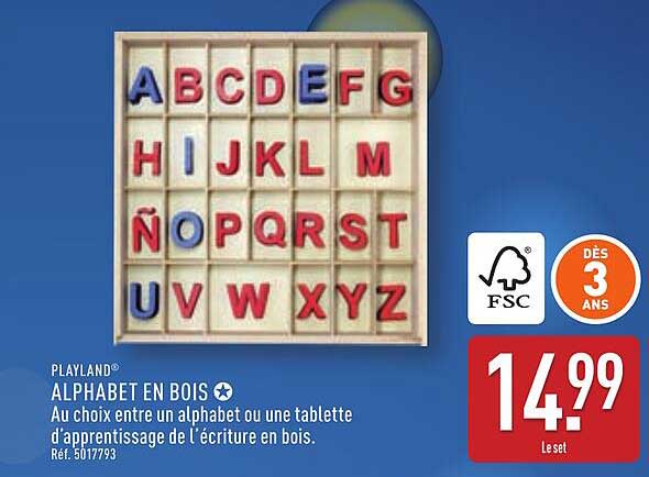 Découvrez dès maintenant la offre ALPHABET EN BOIS dans le catalogue de ALDI. Cette offre est valable du 19/11/2024 au 25/11/2024.