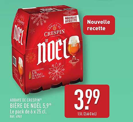 Découvrez l'offre de Bière De Noël 5,9° chez ALDI! Cette offre fantastique est maintenant disponible dans le nouveau catalogue de ALDI. Profitez de cette occasion et économisez considérablement sur votre achat.