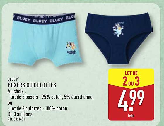 Cette offre vous permet d'obtenir un lot de 2 boxers ou 3 culottes pour seulement 4,99 €. C'est une occasion à ne pas manquer, car le prix habituel de ces articles est généralement plus élevé. En profitant de cette promotion, non seulement vous économisez, mais vous garantissez également à vos enfants des sous-vêtements de qualité.