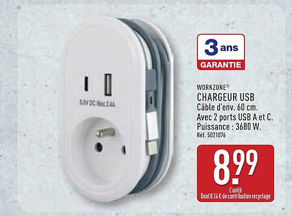 Découvrez le chargeur USB WORKZONE®, parfait pour tous vos appareils électroniques. Avec un câble de 60 cm, ce chargeur est idéal pour recharger vos smartphones, tablettes et autres appareils portables en toute simplicité. Sa puissance de 3680 W et ses deux ports USB A et C en font un accessoire incontournable pour les utilisateurs modernes. Que vous soyez à la maison ou en déplacement, ce chargeur vous garantit une recharge rapide et efficace.