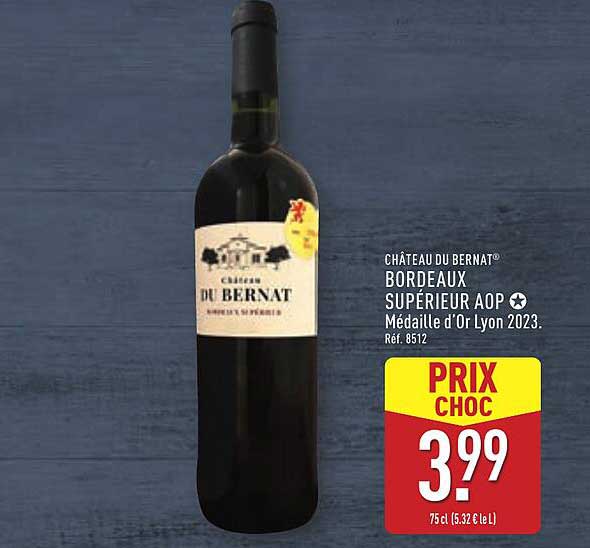 Découvrez dès maintenant la offre CHÂTEAU DU BERNAT® BORDEAUX SUPÉRIEUR AOP dans le catalogue de ALDI. Cette offre est valable du 01/04/2025 au 07/04/2025.
