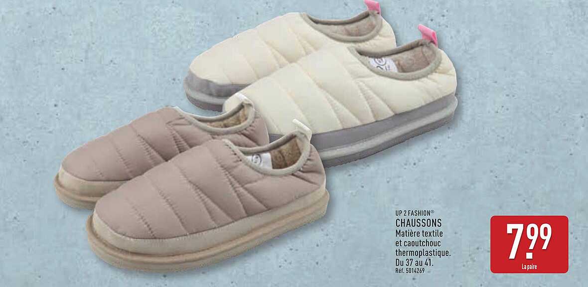 Découvrez l'offre de Chaussons chez ALDI! Cette offre fantastique est maintenant disponible dans le nouveau catalogue de ALDI. Profitez de cette occasion et économisez considérablement sur votre achat.