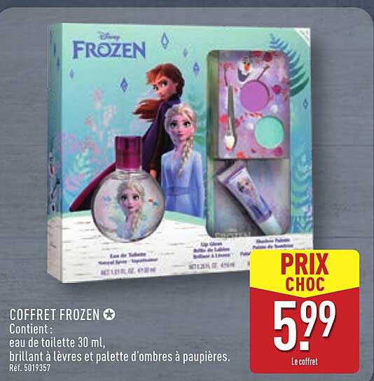 Découvrez le coffret Frozen, une offre irrésistible pour les fans des célèbres héroïnes Anna et Elsa. Composé d'une eau de toilette de 30 ml, d'un brillant à lèvres et d'une palette d'ombres à paupières, ce coffret est parfait pour égayer la routine beauté des enfants et des passionnés de la saga Disney. Profitez de cette promotion en exclusivité chez ALDI.En promotion du 4 au 10 novembre 2025, c'est l'occasion rêvée de faire plaisir ou de se faire plaisir !