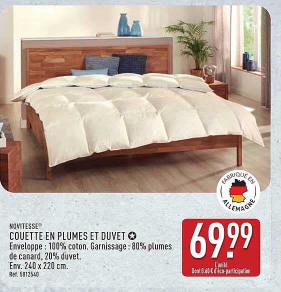 Découvrez la couette en plumes et duvet NOVITÉSSE®, votre alliée parfaite pour des nuits paisibles. Avec sa composition de 80% de plumes de canard et 20% de duvet, cette couette offre une chaleur et un confort incomparables. Fabriquée en Allemagne, elle vous garantit qualité et durabilité, idéale pour affronter les nuits fraîches.