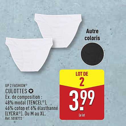 Découvrez la superbe offre de Culottes dans le nouveau catalogue de ALDI. En plus de cette offre, vous trouverez de nombreuses autres réductions attrayantes. Vous pouvez facilement commander le Culottes en ligne via le site web de ALDI ou l'acheter dans un magasin près de chez vous.