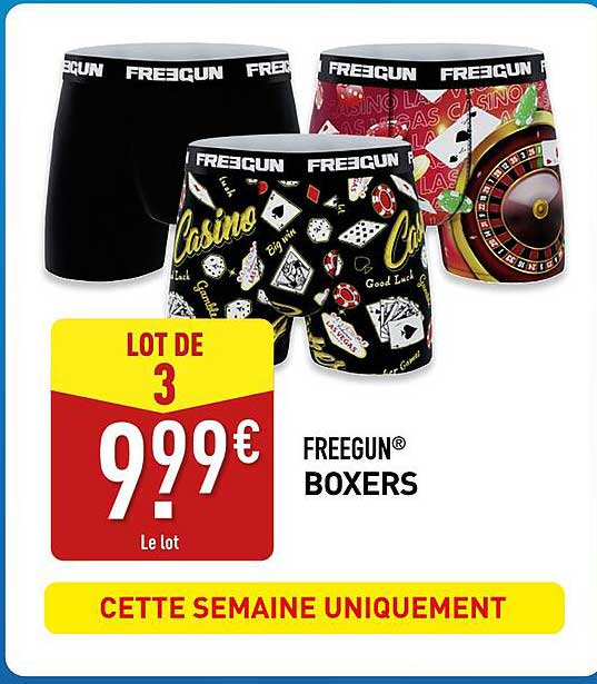 Découvrez une offre incroyable sur une collection de boxers FREEGUN! Ce lot de trois pièces est parfait pour renouveler votre garde-robe de sous-vêtements. Avec des motifs variés inspirés du casino, ces boxers allient confort et style. Profitez de cette promotion exclusive qui ne dure que quelques jours.