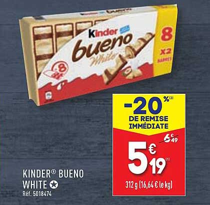 Découvrez la superbe offre de Kinder® Bueno White dans le nouveau catalogue de ALDI. En plus de cette offre, vous trouverez de nombreuses autres réductions attrayantes. Vous pouvez facilement commander le Kinder® Bueno White en ligne via le site web de ALDI ou l'acheter dans un magasin près de chez vous.