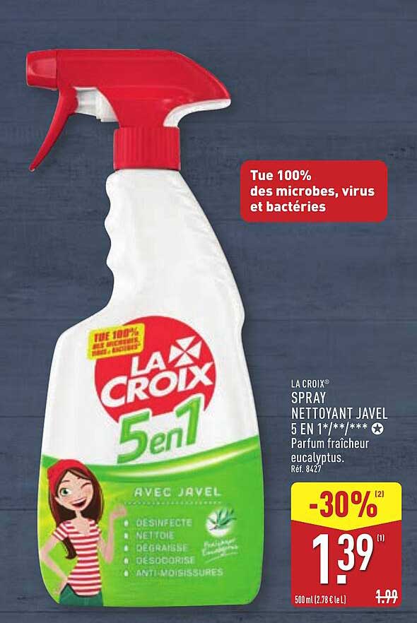 Découvrez l'offre de La Croix® Spray Nettoyant Javel 5 En 1 chez ALDI! Cette offre fantastique est maintenant disponible dans le nouveau catalogue de ALDI. Profitez de cette occasion et économisez considérablement sur votre achat.