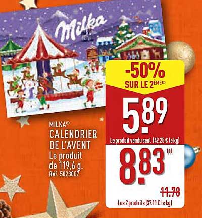 Au prix exceptionnel de 5,89 €, ce calendrier de l’Avent est proposé avec une incroyable réduction de 50% sur le deuxième produit. Ainsi, pour seulement 8,83 € pour deux unités, vous pouvez partager la magie des fêtes avec un proche, tout en réalisant des économies considérables sur le prix habituel de 11,79 €.