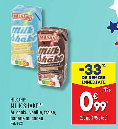 Découvrez la superbe offre de Milsani® Milk Shake® dans le nouveau catalogue de ALDI. En plus de cette offre, vous trouverez de nombreuses autres réductions attrayantes. Vous pouvez facilement commander le Milsani® Milk Shake® en ligne via le site web de ALDI ou l'acheter dans un magasin près de chez vous.