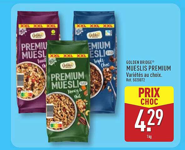 Les Mueslis Premium de Golden Bridge sont une excellente option pour commencer la journée sur une note savoureuse et nourrissante. Disponibles en différentes variétés telles que fruit et chocolat ou miel et noix, ces mueslis sont parfaits pour les amateurs d'un petit déjeuner équilibré. Offerts à un prix choc, ces produits ne manqueront pas de vous séduire. Pourquoi ne pas vous laisser tenter par cette offre avantageuse, valable jusqu'au 4 août 2025 ?