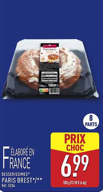 Découvrez la délicieuse pâtisserie Paris Brest d'ALDI, élaborée en France. Ce gâteau tendre et croustillant, composé de pâte à choux garnie de crème pralinée, est parfait pour toutes les occasions. Que ce soit pour une fête d'anniversaire, un goûter entre amis ou simplement pour se faire plaisir, il saura séduire vos papilles.