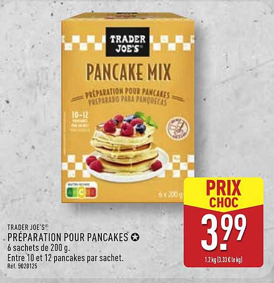 Amateurs de petit-déjeuner savoureux, cette offre est faite pour vous ! La préparation pour pancakes de Trader Joe's, disponible chez ALDI, vous permet de déguster de délicieux pancakes en un rien de temps. Parfaite pour les dimanches matin ou les brunchs entre amis, cette préparation va ravir les papilles des petits comme des grands.