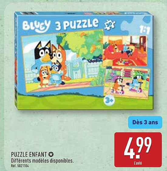 Découvrez les joyeuses scènes des aventures de Bluey avec ce magnifique puzzle enfant proposé par ALDI. Conçu pour les petits, ce puzzle sera non seulement un moment de divertissement, mais également un complément idéal pour développer la motricité fine et la concentration des plus jeunes. Cette offre est valable du 21 au 27 octobre 2025. Ne manquez pas cette chance de proposer à vos enfants un moment ludique et éducatif !