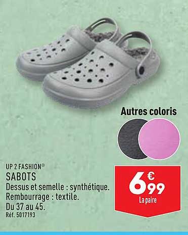 Découvrez la superbe offre de Sabots dans le nouveau catalogue de ALDI. En plus de cette offre, vous trouverez de nombreuses autres réductions attrayantes. Vous pouvez facilement commander le Sabots en ligne via le site web de ALDI ou l'acheter dans un magasin près de chez vous.