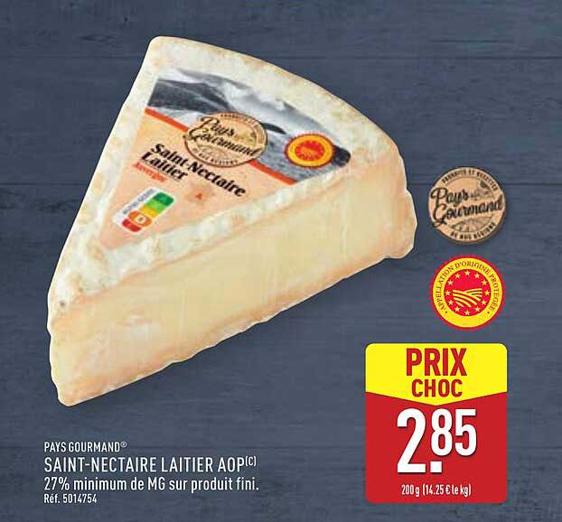 Avec un prix choc de seulement 2,85 € pour 200 g, c'est une occasion à ne pas manquer ! Habituellement, le Saint-Nectaire se trouve dans les commerces à un prix bien supérieur. Profitez de cette réduction pour refaire le plein de saveurs sans grever votre budget.