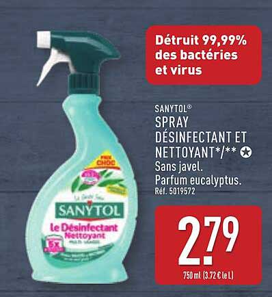 Découvrez l'offre de Sanytol® Spray Désinfectant Et Nettoyant chez ALDI! Cette offre fantastique est maintenant disponible dans le nouveau catalogue de ALDI. Profitez de cette occasion et économisez considérablement sur votre achat.