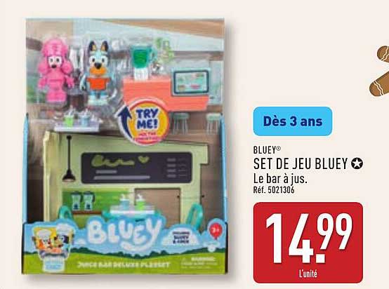 Découvrez dès maintenant la offre SET DE JEU BLUEY Le bar à jus. dans le catalogue de ALDI. Cette offre est valable du 11/11/2025 au 17/11/2025.