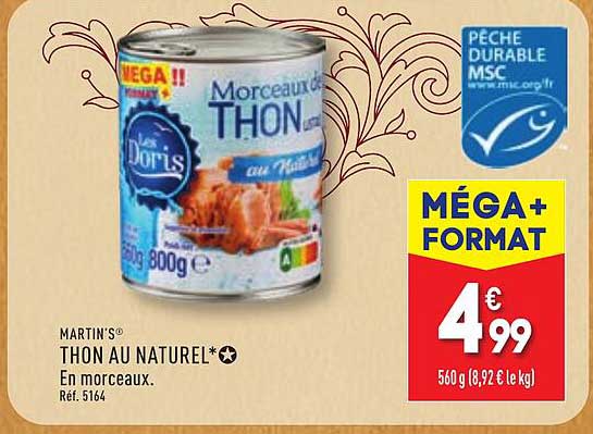 Découvrez l'offre de Thon Au Naturel* chez ALDI! Cette offre fantastique est maintenant disponible dans le nouveau catalogue de ALDI. Profitez de cette occasion et économisez considérablement sur votre achat.