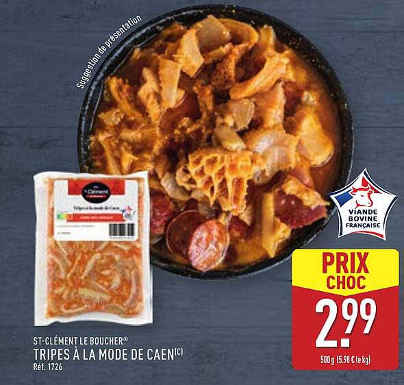 Découvrez dès maintenant la offre TRIPES À LA MODE DE CAEN dans le catalogue de ALDI. Cette offre est valable du 01/04/2025 au 07/04/2025.