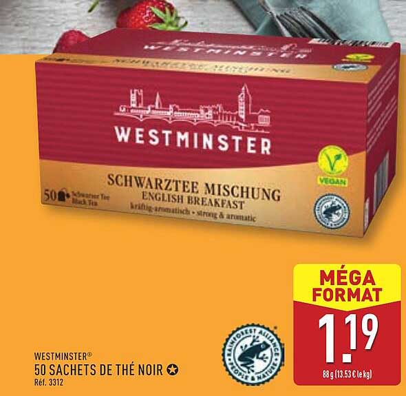 Découvrez dès maintenant la offre WESTMINSTER 50 SACHETS DE THÉ NOIR dans le catalogue de ALDI. Cette offre est valable du 11/03/2025 au 17/03/2025.