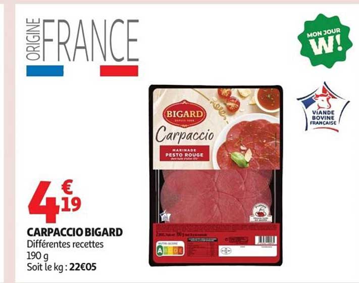 Vous recherchez un délice prêt à déguster ? Découvrez le Carpaccio Bigard, une merveille culinaire qui ravira vos papilles. Avec sa marinade au pesto rouge, cet assortiment de fines tranches de viande de qualité est parfait pour vos apéros ou vos plats raffinés. N'attendez plus pour savourer cette offre exceptionnelle !