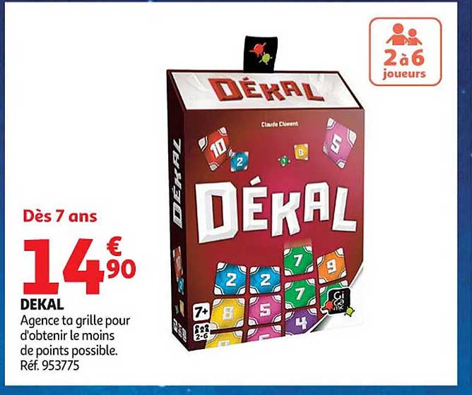 Découvrez DÉKAL, un jeu captivant pour les amateurs de stratégie et de réflexion ! Destiné aux enfants dès 7 ans, ce jeu promet des heures de divertissement en famille ou entre amis. Avec DÉKAL, l'objectif est simple : agencer votre grille pour obtenir le moins de points possible. Une compétition amicale qui ravira les petits comme les grands !