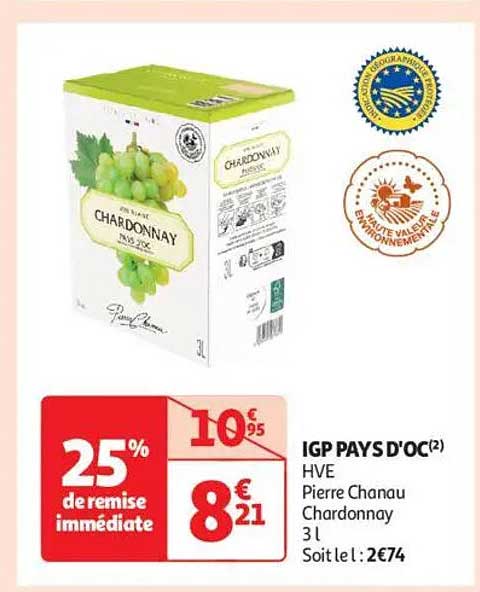 Découvrez dès maintenant la offre IGP PAYS D'OC HVE Pierre Chanau Chardonnay 3 L dans le catalogue de Auchan Supermarché. Cette offre est valable du 08/04/2025 au 21/04/2025.