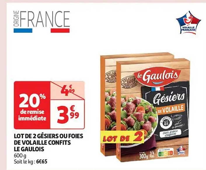 Découvrez l'excellence gastronomique avec le lot de 2 gésiers ou foies de volaille confits Le Gaulois. Provenant directement de France, cette offre vous permet de savourer des produits de qualité à un prix défiant toute concurrence. Que vous soyez un amateur de cuisine traditionnelle ou un gourmet à la recherche de nouvelles saveurs, cette promotion est faite pour vous !
