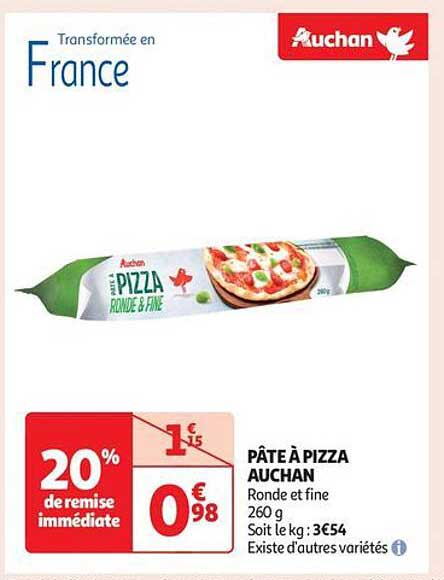 Découvrez la pâte à pizza Auchan, un indispensable pour vos soirées pizzas à la maison. Avec cette offre, vous profitez d'une remise immédiate de 20%, ce qui rend la création de vos plats préférés encore plus accessible et savoureuse. Que ce soit pour un dîner en famille ou une soirée entre amis, cette pâte saura répondre à toutes vos envies gourmandes.